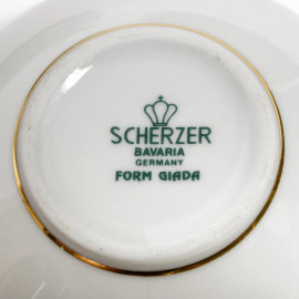 Servizio in porcellana con rifiniture nei toni del blu e dell'oro, "Scherzer", Germania, XX secolo, misure massime cm 20x28, composto da: