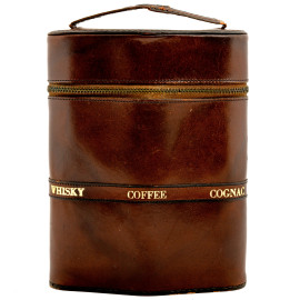 Set da viaggio per liquori in custodia in pelle, anni Settanta del XX secolo, cm 19,5x15,5x7, (segni di usura)