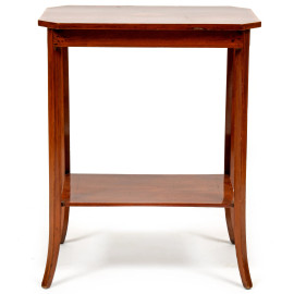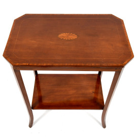 Tavolinetto in mogano con filettature in varie essenze. Piano sagomato con intarsio centrale. XX secolo, cm 73x5x58,5x37,5, (difetti)