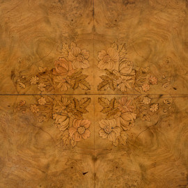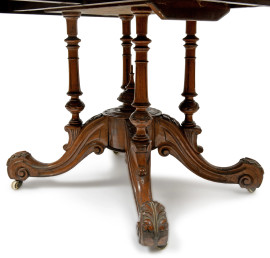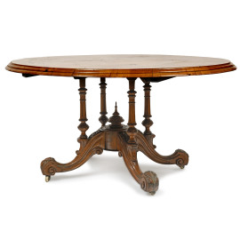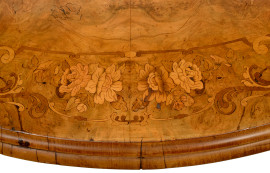 Tavolo a vela con piano ovale intarsiato in varie essenze a motivi vegetali, poggiante su quattro colonnine tornite terminanti su raccordo circolare con quattro gambe mosse con rotelle XX secolo, cm 83,5x146x108,5, (difetti)