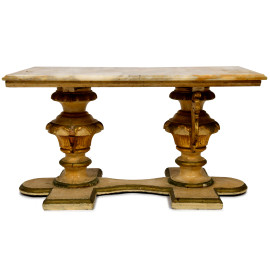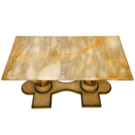 Tavolo basso con struttura in legno laccato, dorato e intagliato con piano rettangolare in onice, XX secolo, cm 51x93x48, (difetti)