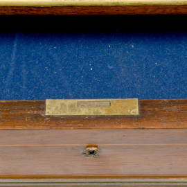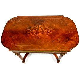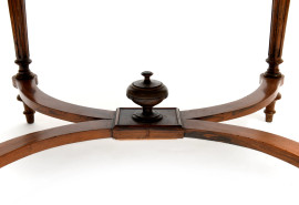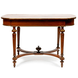 Tavolo scrittoio in noce con filetti e intarsi in bosso. Quattro gambe scanalate e rastremate raccordate da due traverse ad arco, XIX secolo, cm 74x116x70,5, (segni di usura)