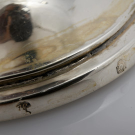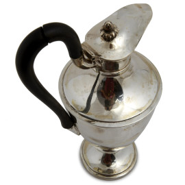 Versatoio in argento con presa in legno laccato, peso lordo gr 690, altezza cm 30,5, (difetti e rotture)