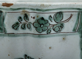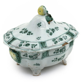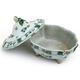 Zuppiera in maiolica nei toni del bianco e del verde con decori floreali. Presa a rilievo a foggia di fiore e poggiante su quattro piedini. XX secolo, cm 19x25,5x23, (difetti e sbeccature)