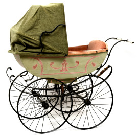 Carrozzina da neonato, materiali vari, primo XX secolo, cm 122x118,5x53, (difetti, parti sostituite)