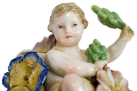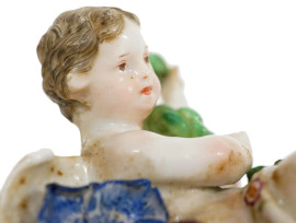 Coppia di putti con palmette in porcellana policroma, vecchia manifattura, cm 11,5, (difetti)