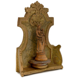 Edicola votiva con intagli a volute e conchiglia sommitale, ospitante una scultura della Madonna con Bambino in legno. La nicchia è ornata con base sagomata e profili dorati. XX secolo, cm 30x20x10, (difetti)