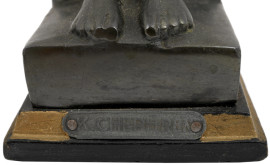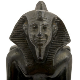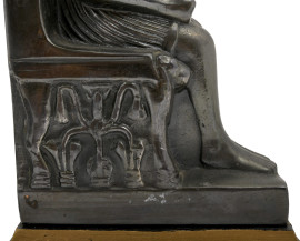 Scultura in bronzo patinato nero raffigurante Chephren seduto in trono con incisioni a rilievo di geroglifici ai lati, base in legno. (difetti), XX secolo, cm 18,5x12x10