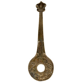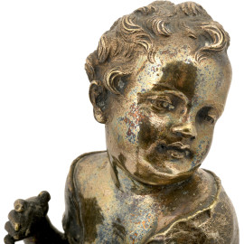 Scultura in metallo argentato raffigurante bambino a guisa di putto che suona uno strumento a corde. XX secolo, cm 37x27x15, (difetti)