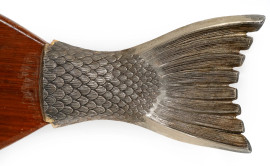 Vassoio da portata o tagliere portapesce in legno di mogano con estremità in metallo argentato finemente cesellato a guisa di testa e coda di pesce. XX secolo, cm 87x24