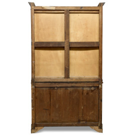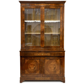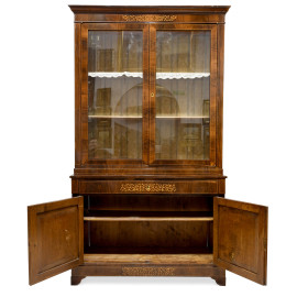 Bookcase impiallacciata in mogano con intarsi e filettature in bosso. Corpo inferiore a due sportelli sormontati da cassetto centrale. Corpo superiore a doppia anta vetrata a triplice ripiano, XIX secolo, cm 241x136x53,5, (rotture, graffi e segni di usura)