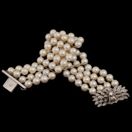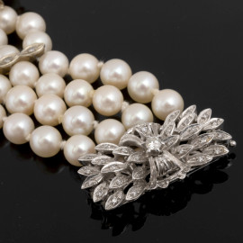 Bracciale a 4 fili di perle con chiusura in oro bianco 750 e brillantini, lunghezza cm 20, peso lordo gr. 60
