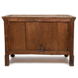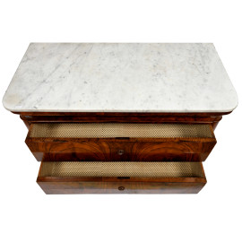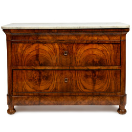 Cassettone in noce e radica di noce con piano in marmo. Fronte a due cassetti. XX secolo, cm 94x125x64,5, (segni di usura)
