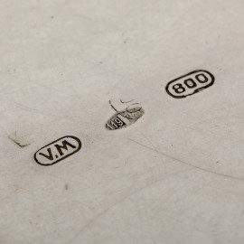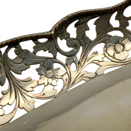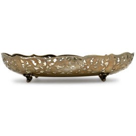 Centravola traforato a motivi floreali poggiante su quattro piedini in argento 800/000, cm 6x29,5x21, peso gr 450