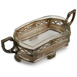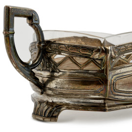 Centrotavola in stile Liberty in cristallo con struttura in metallo cesellato e sbalzato a doppia presa, cm 14x38,5x15 (usura del tempo)
