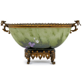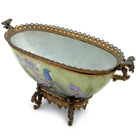 Centrotavola ovale a coppa in porcellana dipinta con decoro naturalstico raffidurante uccellino. Montatura in bronzo finemente lavorata a traforo con prese e base traforata cesellate, XX secolo, cm 23,5x45x15