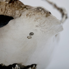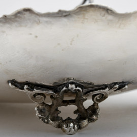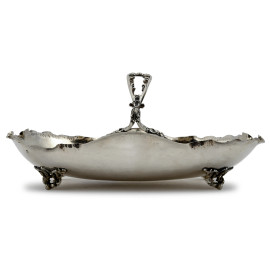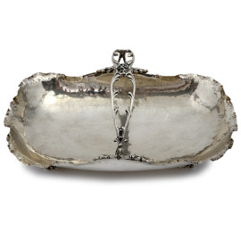 Cestino in argento 800/00 con manico ed orlo cesellati, poggiante su quattro piedini, cm 12,5x30x17, gr. 560