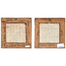 Coppia di dipinti raffiguranti veliero e scorcio montano, olio su tela applicata su tavoletta (lettera manoscritta non pertinente al retro), XX secolo, diametro cm 15 entro cornice