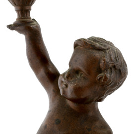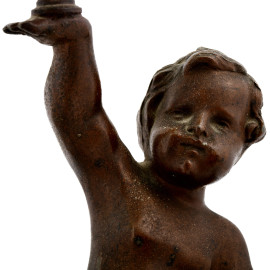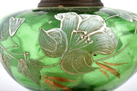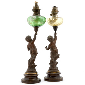 Coppia di lampade ad olio convertite in bronzo, legno e vetri colorati e dipinti, XX secolo, altezza cm 52 (da revisionare, segni di usura)