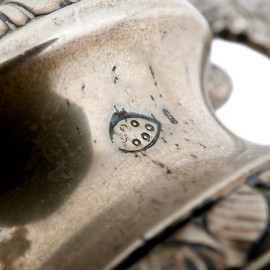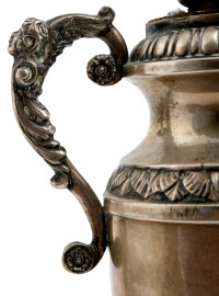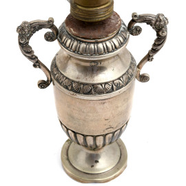 Coppia di lampade con base in argento 800/000, finemente cesellato con prese di ispirazione rinascimentale con volti femminili, XX secolo, altezza cm 40, peso lordo gr 1100 circa, (usura del tempo, ammaccature, difetti, da revisionare)