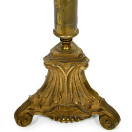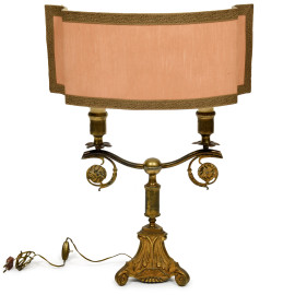 Coppia di lampade da tavola in bronzo dorato e cesellato a due bracci con base a capitello e tre piedini a ricciolo. Diffusori in tessuto color salmone. XIX-XX secolo, cm 43,5x35x18, (da revisionare)