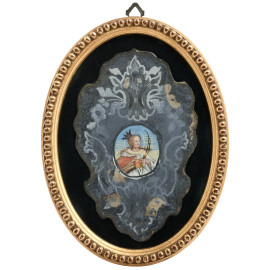 Coppia di piccoli dipinti su specchio al mercurio entro cornici ovali, XX secolo, misure complessive cm 19x14,5, (difetti, mancanze)