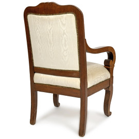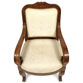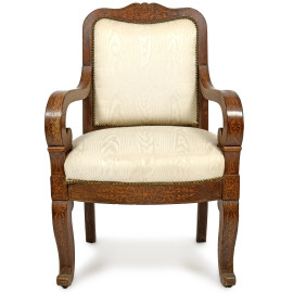 Coppia di poltrone in legno intagliato e intarsiato in varie essenze con seduta in tessuto bianco. Gambe anteriori mosse e braccioli terminanti a ricciolo, XIX secolo, cm 96x59x49, (lievi segni di usura)