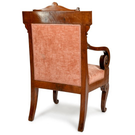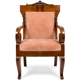 Coppia di poltrone in piuma di mogano con gambe mosse ed elemento apicale intagliato. Seduta e schienale imbottito e rivestito in tessuto rosso, XIX secolo, cm 107x64x60 (rotture, segni di usura)