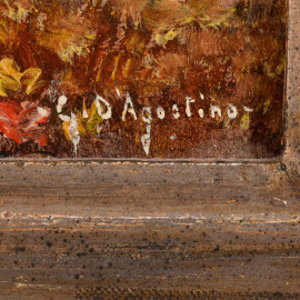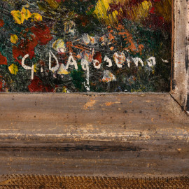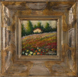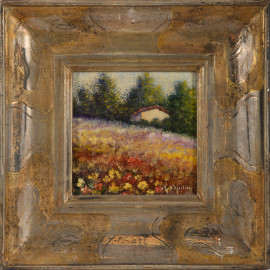 Coppia di scorci di casolare tra distesa fiorita, XX secolo, olio su compensato, cm 19x19, firmati in basso a destra, entro cornice