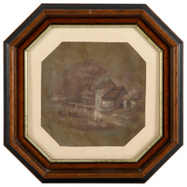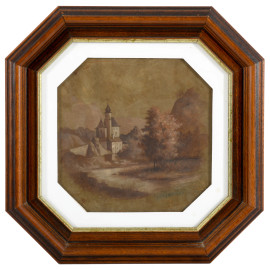 Coppia di scorci di paese con ruscello, XX secolo, stampa su tessuto, cm 23,5x24, compreso passepartout, entro cornice