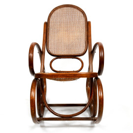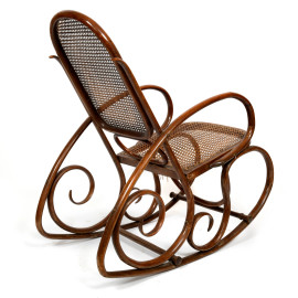 Coppia di sedie a dondolo in legno piegato a vapore con seduta e schienale in vimini, XX secolo, cm 100x92x54,5, (difetti, rotture alle sedute)