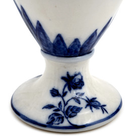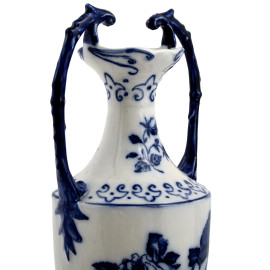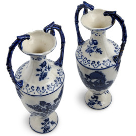 Coppia di vasi biansati in ceramica Ironstone Stadfordshire - England decoratati nei toni del bianco e del blu a motivi vegetali, altezza cm 37, (rotture e restauri)