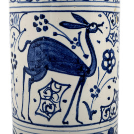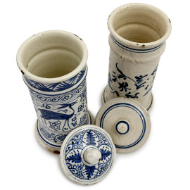 Coppia di vasi da farmacia in maiolica a fondo bianco con decorazioni a girali fogliati e animali, XX secolo, altezza massima cm 24 (cadute di smalto stannifero, difetti di cottura, scalfiture)