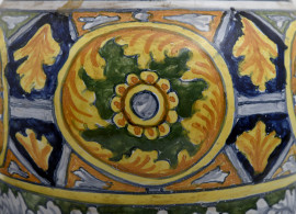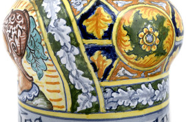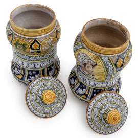 Coppia di vasi da farmacia in maiolica con decori policromi di ispirazione rinascimentale, XX secolo, altezza cm 29 (caduta di smalto stannifero, difetti di cottura)