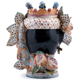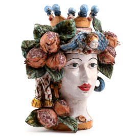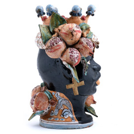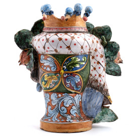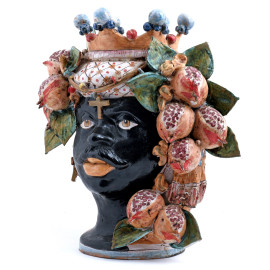 Coppia di vasi in ceramica policroma raffigurante testa di moro e figura femminile, Sicilia XX secolo, firmati alla base "Davide Brancato - Caltagirone", altezza cm 44, (diffuse cadute di smalto, rotture)