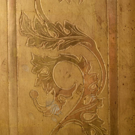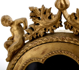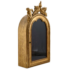 Cornice bacheca in legno dorato e intagliato con elemento apicale a guisa di putti affiancanti decorazioni fogliacee. Interno in velluto magenta, XX secolo, cm 53x28x13,5(segni di usura, putto da ricollocare)
