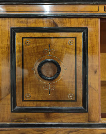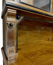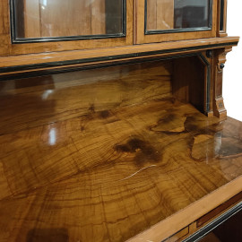 Credenza a doppio corpo in noce con alzata a tre ante vetrate modanate e coronamento centinato a medaglione tornito. Fianchi lisci. Parte inferiore con 2 ante riquadrate affiancanti finto sportello centrale. Decorato con elementi laccati neri, XX secolo, cm241x152x55, (graffi e piccoli segni di usura [..]