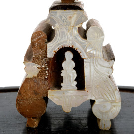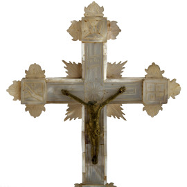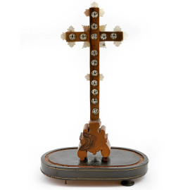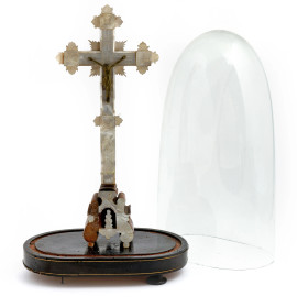 Crocifisso in materiali vari entro teca in legno e vetro, XX secolo, altezza totale cm 35, (difetti, mancanze)