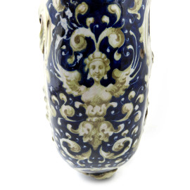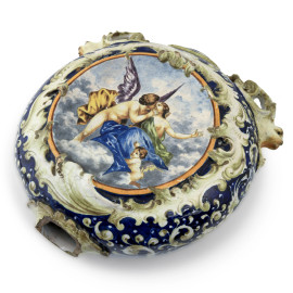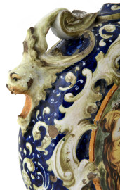 Grande fiasca in ceramica con decorazioni a volute a rilievo, dipinta con scene mitologiche, XIX secolo, cm 37x38x13 circa, (importanti rotture, mancanze, cadute di smalto stannifero, difetti di cottura)
