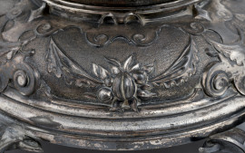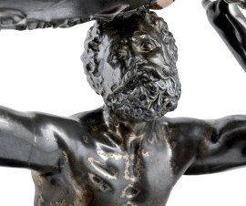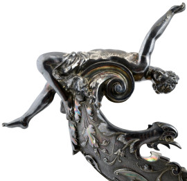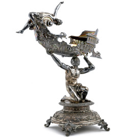 Gruppo scultoreo in metallo argentato di ispirazione mitologica, XX secolo, altezza cm 55, (mancanze, difetti)