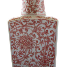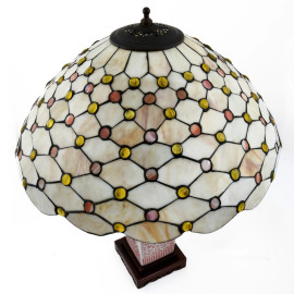 Lampada da tavolo con fusto in porcellana dipinta a motivi floreali nei toni del rosa con base in legno. Paralume in stile Tiffany con tessere policrome in pasta vitrea, altezza cm 69 (da revisionare)