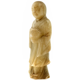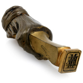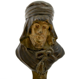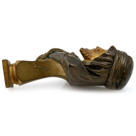 Lotto composto da scultura di dignitario orientale in pietra saponaria e un sigillo in bronzo dorato a foggia di testa di berbero, XX secolo, altezza massima cm 15, (difetti)
