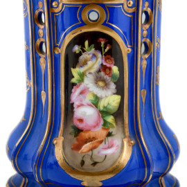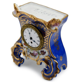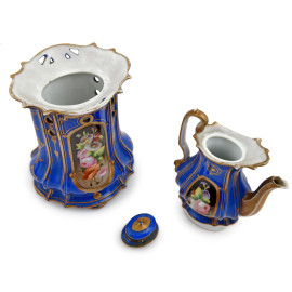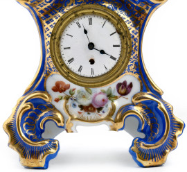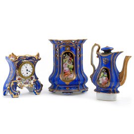 Lotto composto da teiera, scaldavivande e orologio in porcellana nei toni del blu e dell'oro con decori floreali policromi, XIX secolo, misura massima cm 27,5x12x10,5, (cadute di colore e doratura, piccole scalfiture)