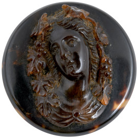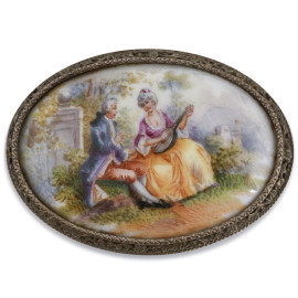Lotto composto da tre cammei e miniatura ovale in porcellana con profilo in argento cesellato con scena galante, misura massima cm 7,5x5,5