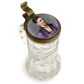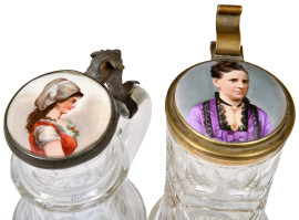 Lotto di due boccali in vetro con coperchio in porcellana con ritratti, XX secolo, altezza massima cm 19,5, (segni di usura)