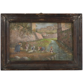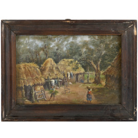 Lotto di due dipinti con scene di vita quotidiana del villaggio, olio su cartone, cm 22x33 entro cornice, firmati in basso