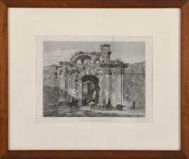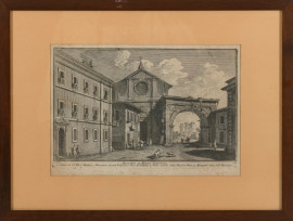 Lotto di due stampe raffiguranti Porta San Pancrazio e Monastero dei monaci Cistercensi di Roma, XIX-XX secolo, misure massime cm 36x48,5 compreso passepartout (usura del tempo)