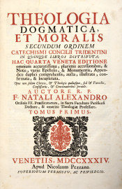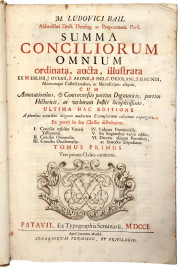 Lotto di due volumi: Summa Conciliorum Omnium, 1701; Theologia Dogmatica et Moralis R.P.F. Natalis Alexandri 1734 (gore, umidità, strappi)
