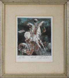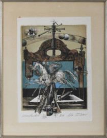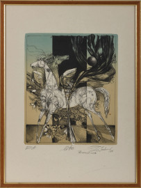 Lotto di tre litografie a colori di Lyubomir Yordanov, raffiguranti composizioni con cavalli, misure massime cm 64x49 compreso passepartout entro cornice