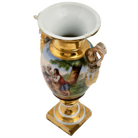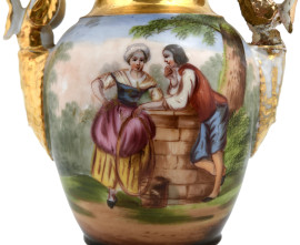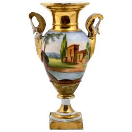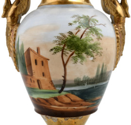 Lotto di tre vasetti biansati a foggia di cigno in Stile Impero in ceramica dorata e dipinta con scene campestri, altezza massima cm 28, (cadute di colore e doratura, felature e mancanze)